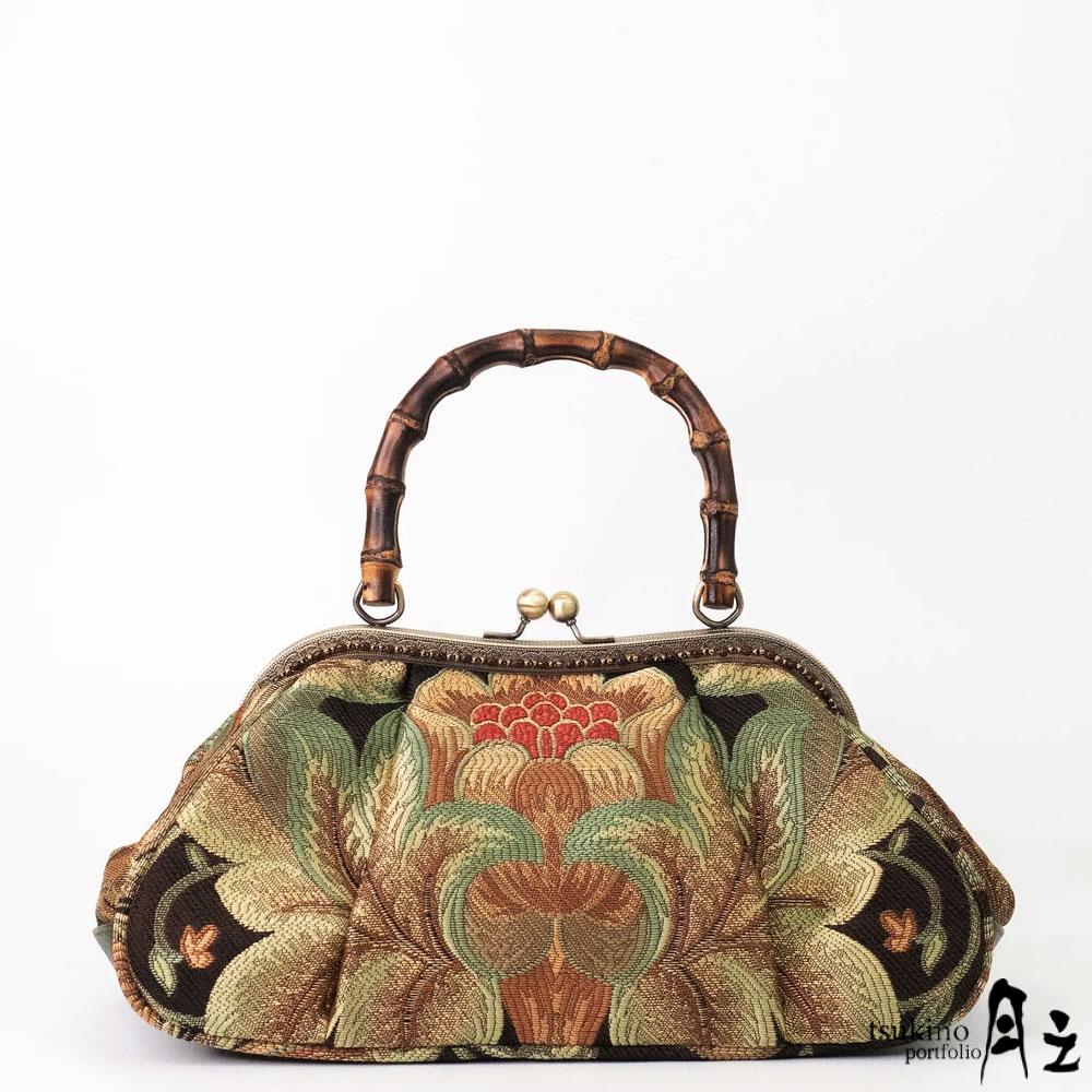 レリーフ模様を施した美しい口金を、小さなビーズで留め付けました。華やかさと可憐さが同居する、オトナの魅力にあふれたシリーズです。ビーズの色や並び順は素材に合わせてセレクトしています。竹細工の持ち手、ゆるくカーブした口金、タック入りのふっくらボディと、特徴的なパーツを美しくまとめまとめました。月之デザインの傑作です。
