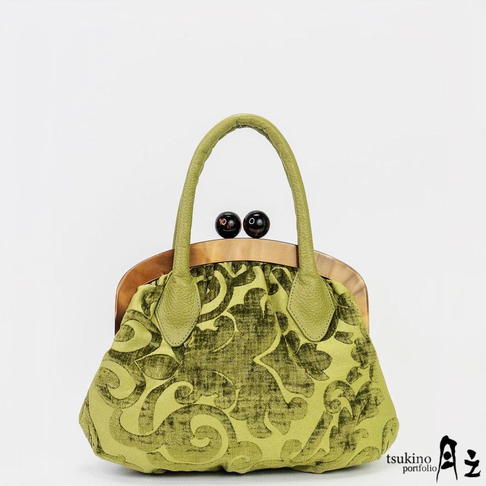 口金は厚みのあるアクリル製。きれいなマーブル模様がレトロな印象を与えます。ボディはふくふくに、持ち手はすっきりとシンプルに、いろいろなコーディネートで持ってみたくたくなるバランスのよいシルエットに仕上げました。